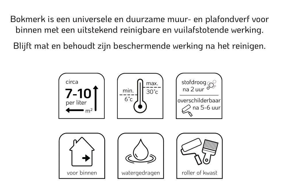 Het aanbrengen van Bokmerk Muurverf Extramat is heel eenvoudig. Je hebt alleen een roller of een kwast nodig. Zorg er wel voor dat de ondergrond schoon, droog en vetvrij is voordat je begint. Roer de verf goed door voor gebruik en breng de verf aan in dunne, gelijkmatige lagen. Laat de verf goed drogen tussen de lagen.