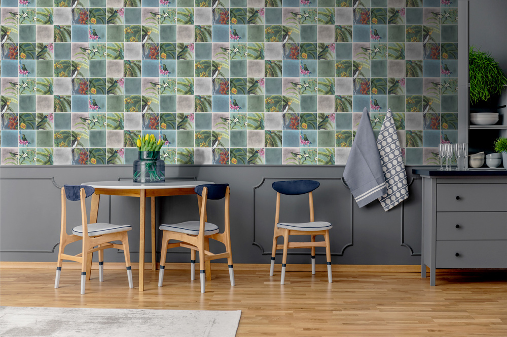 Vind jouw kleur voor Behang Escapade Tegel/Vogel Groen/Blauw L793-04