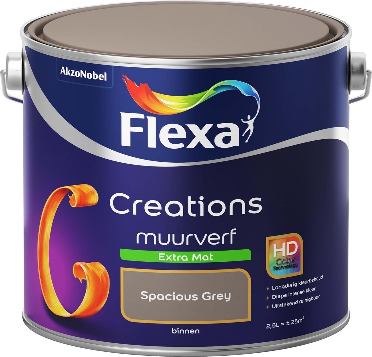 Deze muurverf is voor binnen en breng je aan met een acrylkwast of muurverfroller, op de muur en plafond bij jou thuis of op kantoor. De verf is geschikt voor ondergronden bedekt met (bak)steen, glasweefsel, papierbehang, (glad) pleisterwerk, latex muurverf, gipskarton en beton. De dekking van de Spacious Grey Flexa is perfect dankzij haar extra matte structuur en is geheel watergedragen.