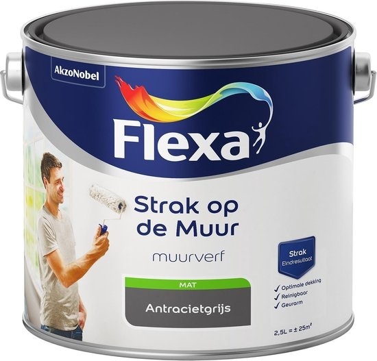 De Flexa Strak op de Muur Muurverf Mat Antraciet 2.5 liter is een goed dekkende muurverf voor binnen. Deze matte Flexa muurverf is geschikt voor (bak)steen, beton, papierbehang, gipskarton, bestaande muurverflagen, glasweefsel, schoon metselwerk en (glad) stucwerk binnenshuis.