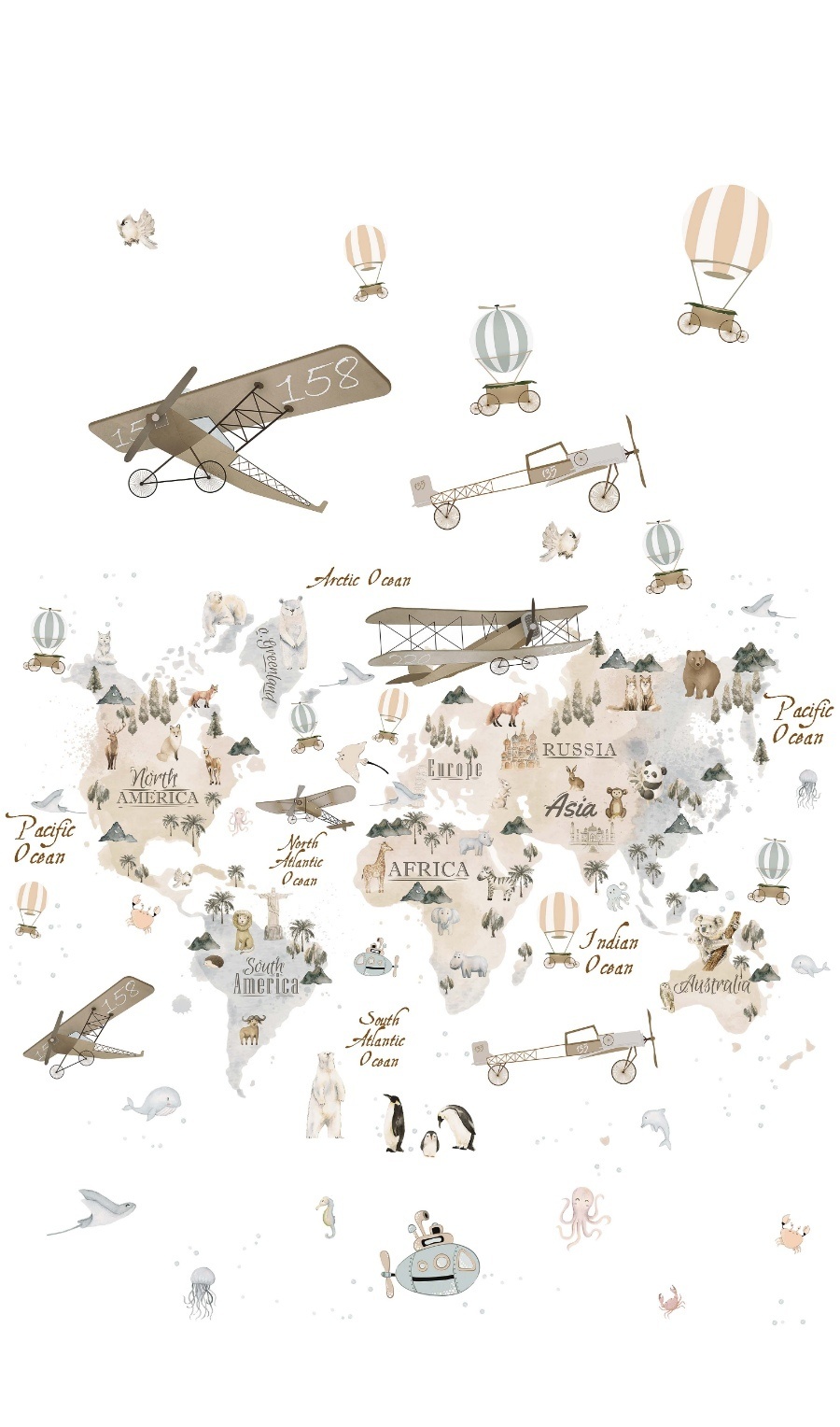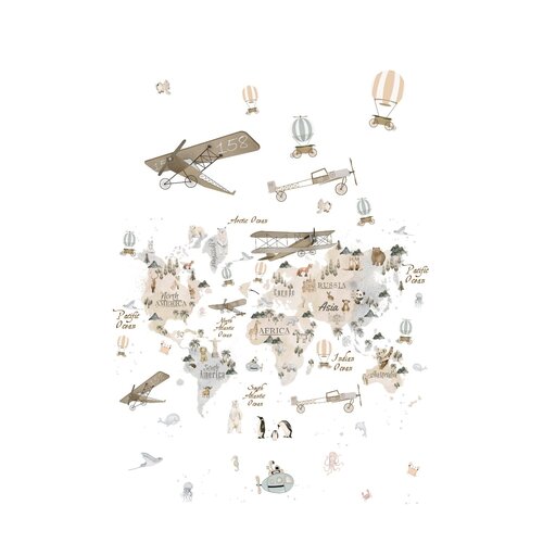 Kids Walls Fotobehang met beige wereldkaart met dieren en vliegtuigen - 45858
