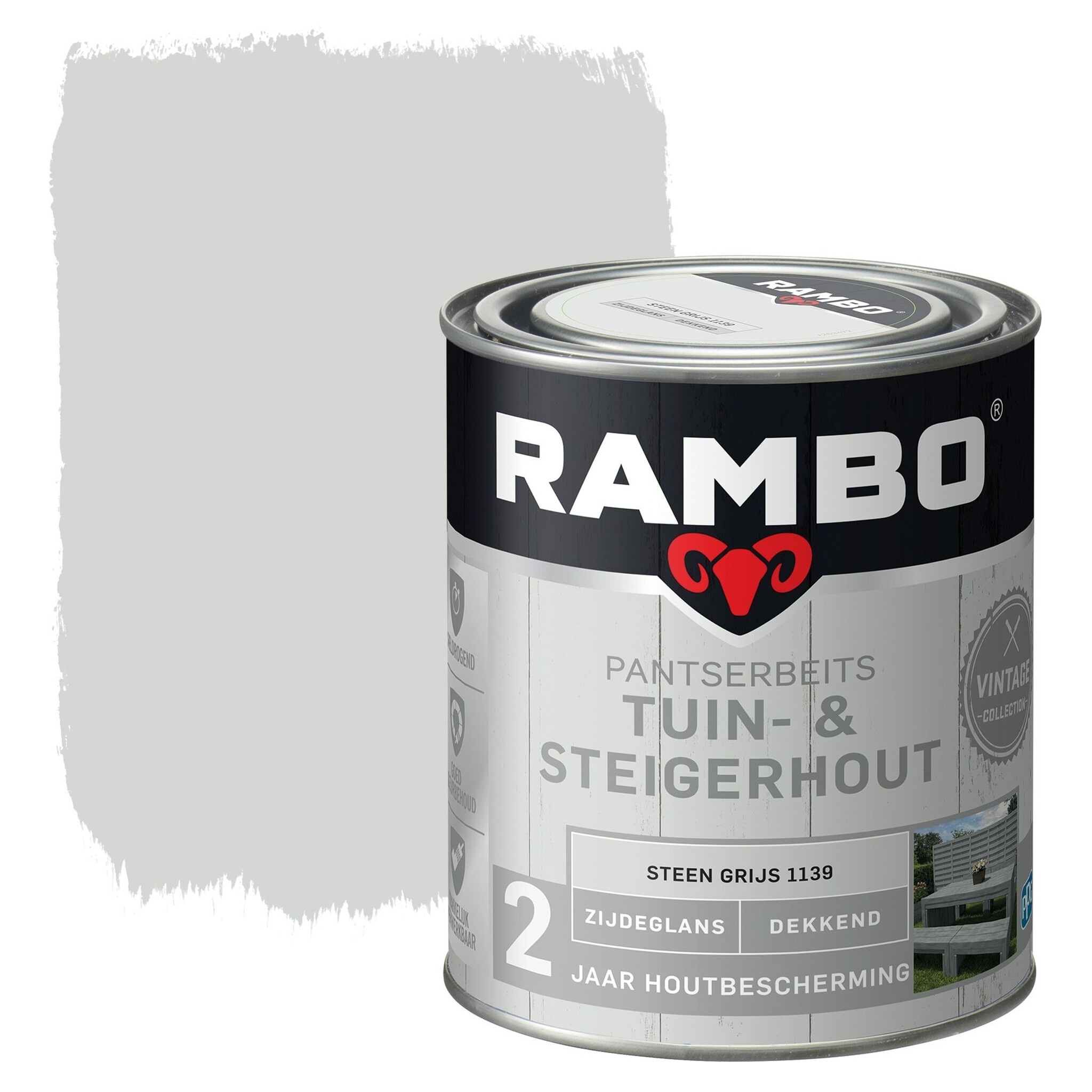 De Rambo Pantserbeits Tuin- & Steigerhout Zijdeglans Dekkend is een beits die voor bescherming en een vintage uitstraling zorgt. Beschermt voor 2 jaar lang tegen alle weersomstandigheden. Door zijn elastische eigenschappen beweegt de beits mee met de natuurlijke houtwerking. Geschikt voor het aanbrengen op ondergronden zoals: