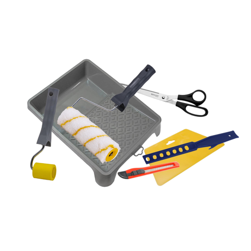 - afbreekmes, behangnaadrol, roerstokje, schaar, verfrolbeugel, verfbak, aandrukspatel.