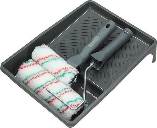 Deze set kun je gebruiken voor het schilderen van muren. Er zit een verfbakje bij, waarin je de verf kunt doen. Verder bevat het 2 handige muurverfrollers, die ieder een andere breedte hebben, voor een optimaal resultaat. Tot slot zitten er beugels bij, zodat je het daarmee op een ergonomische manier kunt aanbrengen.