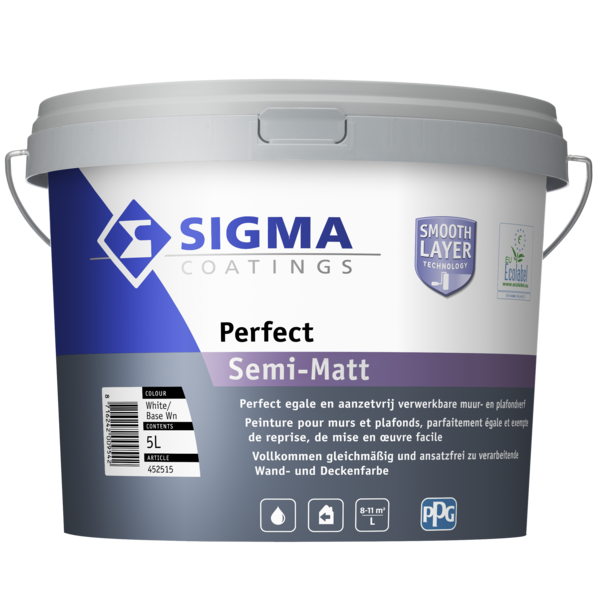 Sigma Perfect Semi-Matt is een muur-en plafondverf op waterbasis, met toevoeging van PU-additief. De verf heeft een matte afwerking en schrobklasse 1.