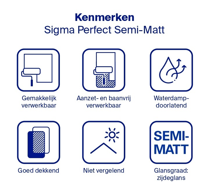 Sigma Perfect Semi-Matt is gemaakt op waterbasis en is daardoor geurarm. Het is goed bestand tegen vlekken en ander soort vuil. De verf bevat schrobklasse 1, waardoor het ideaal is voor in de keuken of andere ruimtes waar vuil kan ontstaan. Denk hierbij aan horecagelegenheden of ziekenhuizen. De verf voldoet aan de HACCP eisen.
